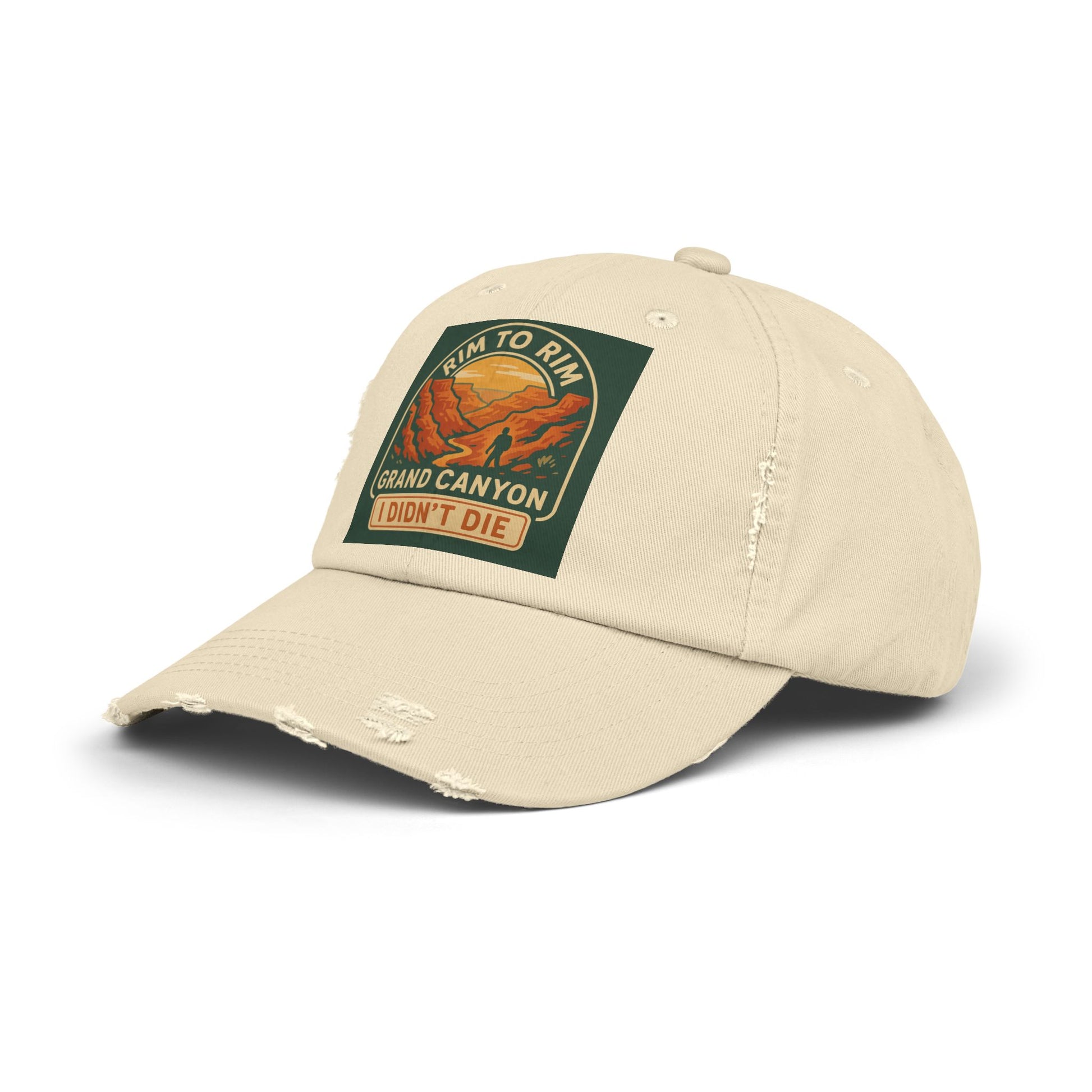 This distressed cap featuring a Rim to Rim Grand Canyon design is perfect for outdoor enthusiasts and nature lovers. The vintage look and comfortable fit make it ideal for everyday wear. It is relevant for holidays, vacations, hiking trips, and outdoor adventures.